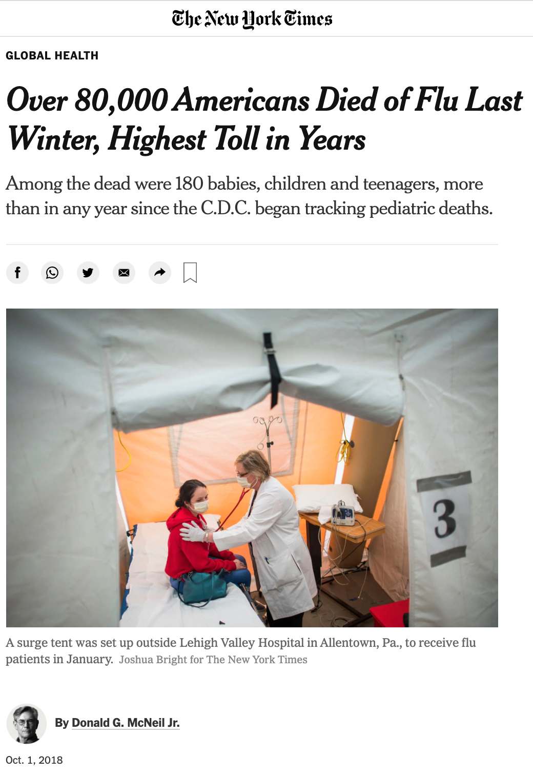 Every year, people die of the flu. Tens of thousands of people in America die of the flu every year. In 2018, according to the CDC, 80,000 people died from the flu.