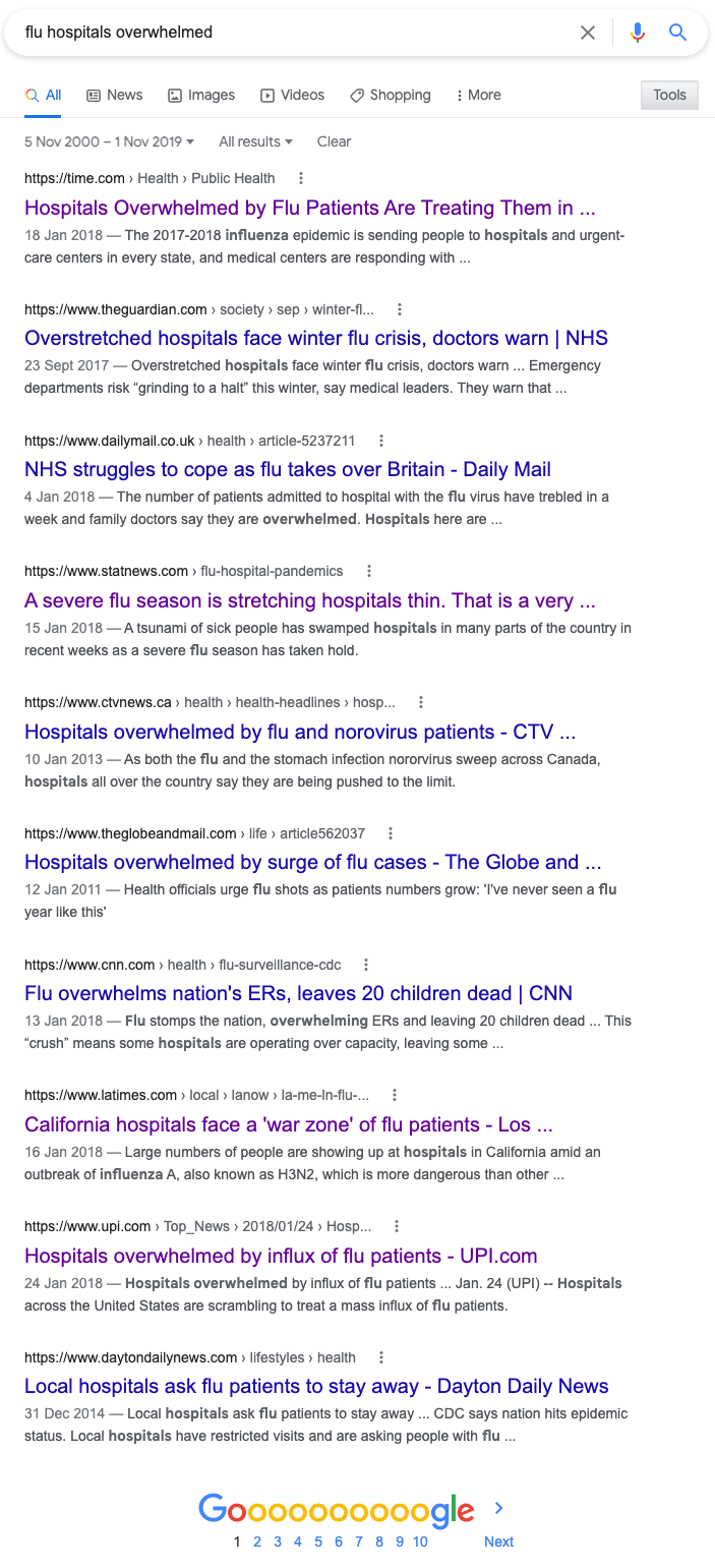 During the 2018 flu season, “hospitals were overwhelmed” without sending home huge portions of the staff and firing people for refusing the vaccine. “Flu hospitals overwhelmed” is another round you can play with the dated Google search game, which I will give full instructions on in due time.