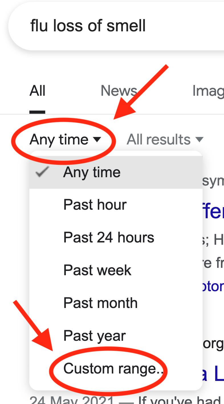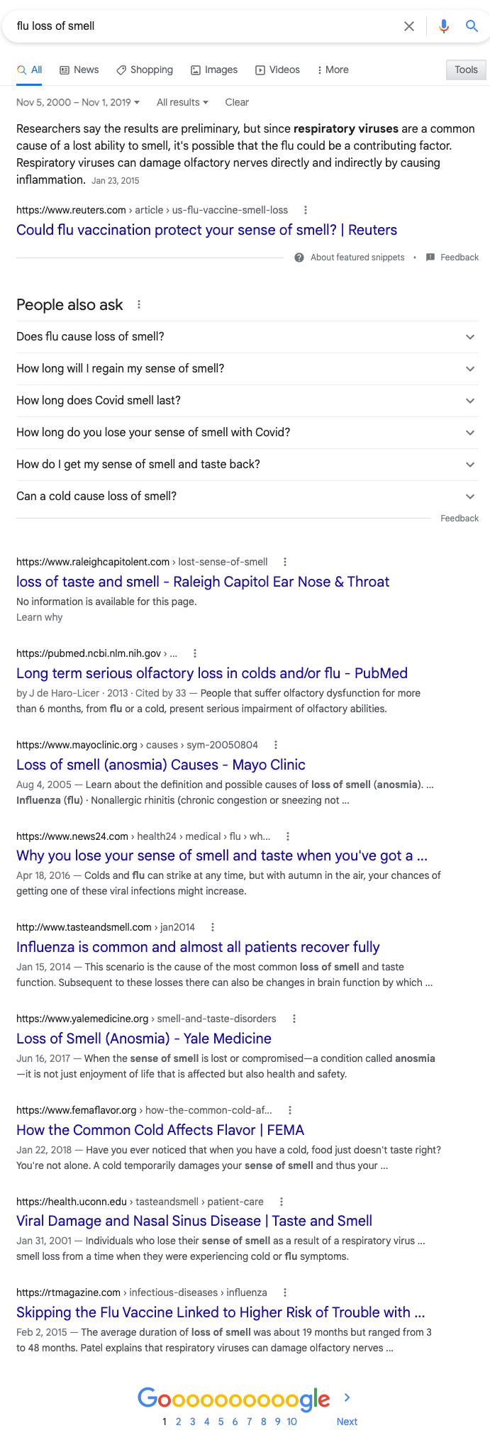 What believers will do is try to claim that there is some specific symptom that defines “covid” and makes it different than other respiratory viruses. Since March of 2020, I’ve played a little game, where you set the Google search to only search posts before December of 2019, then type “flu [alleged symptom unique to covid that was never caused by the flu].”