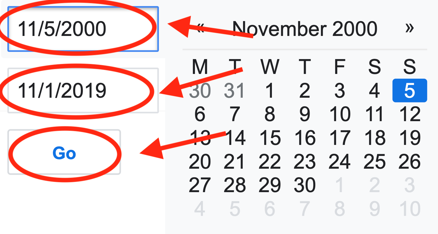 Step five: Enter the custom range that ends before the emergence of the alleged coronavirus by typing dates in the boxes (November 1, 2019 is a good end point), then click the word “go” using your computer “mouse.”