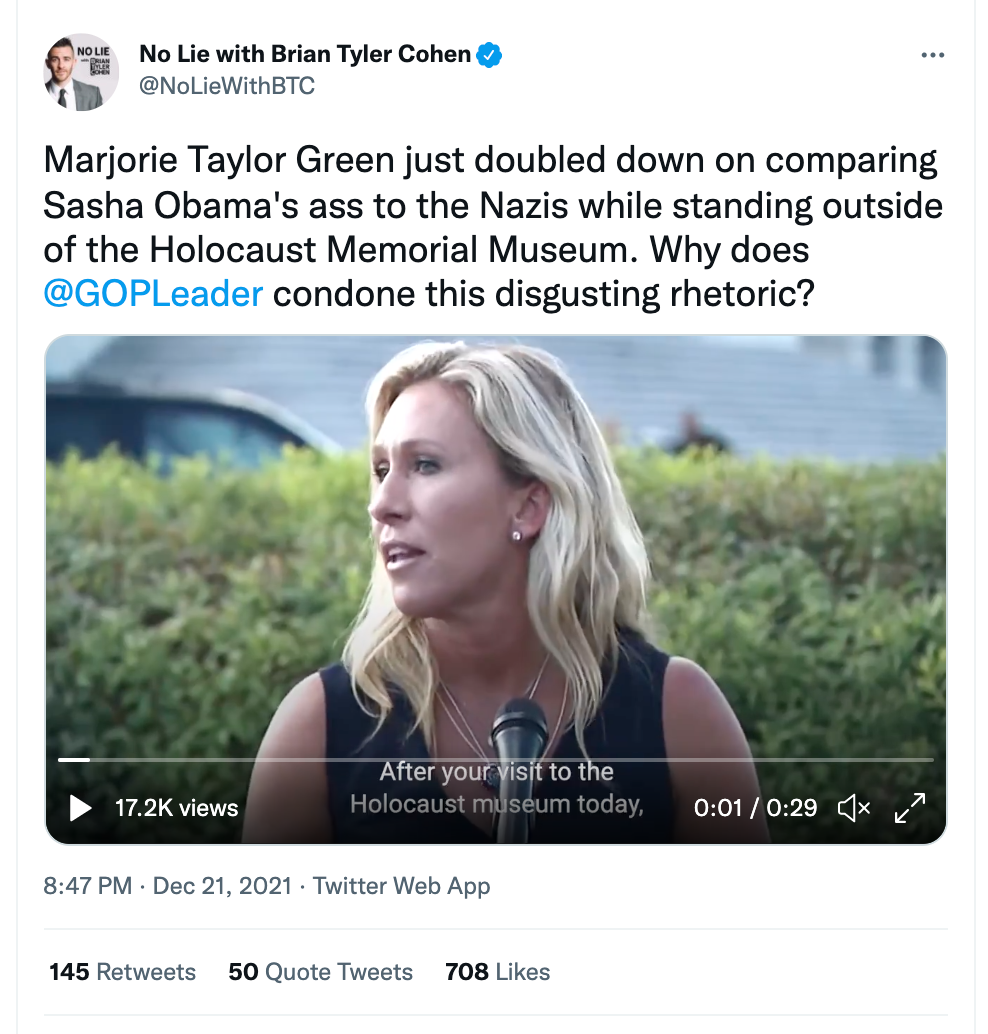 Marjorie Taylor Greene compared Obama’s ass to the Nazis, before being contacted by the Anti-Defamation League who told her that Adolf Hitler killed Anne Frank with typhus because she couldn’t get her ass to jiggle when slapped. Greene rushed to the Holocaust Museum to apologize, but then repeated the claim that Adolf Hitler prevented ass-jiggling in rap music videos, further angering the Jewish lobby.