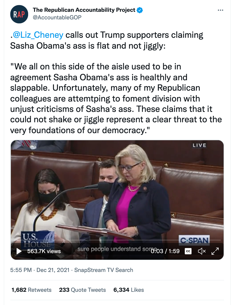Utah Congresswoman Liz Cheney also expressed outrage at the outrage, giving a speech on the floor of the House claiming that criticism of the ass photo was a direct threat to the values of our democracy.