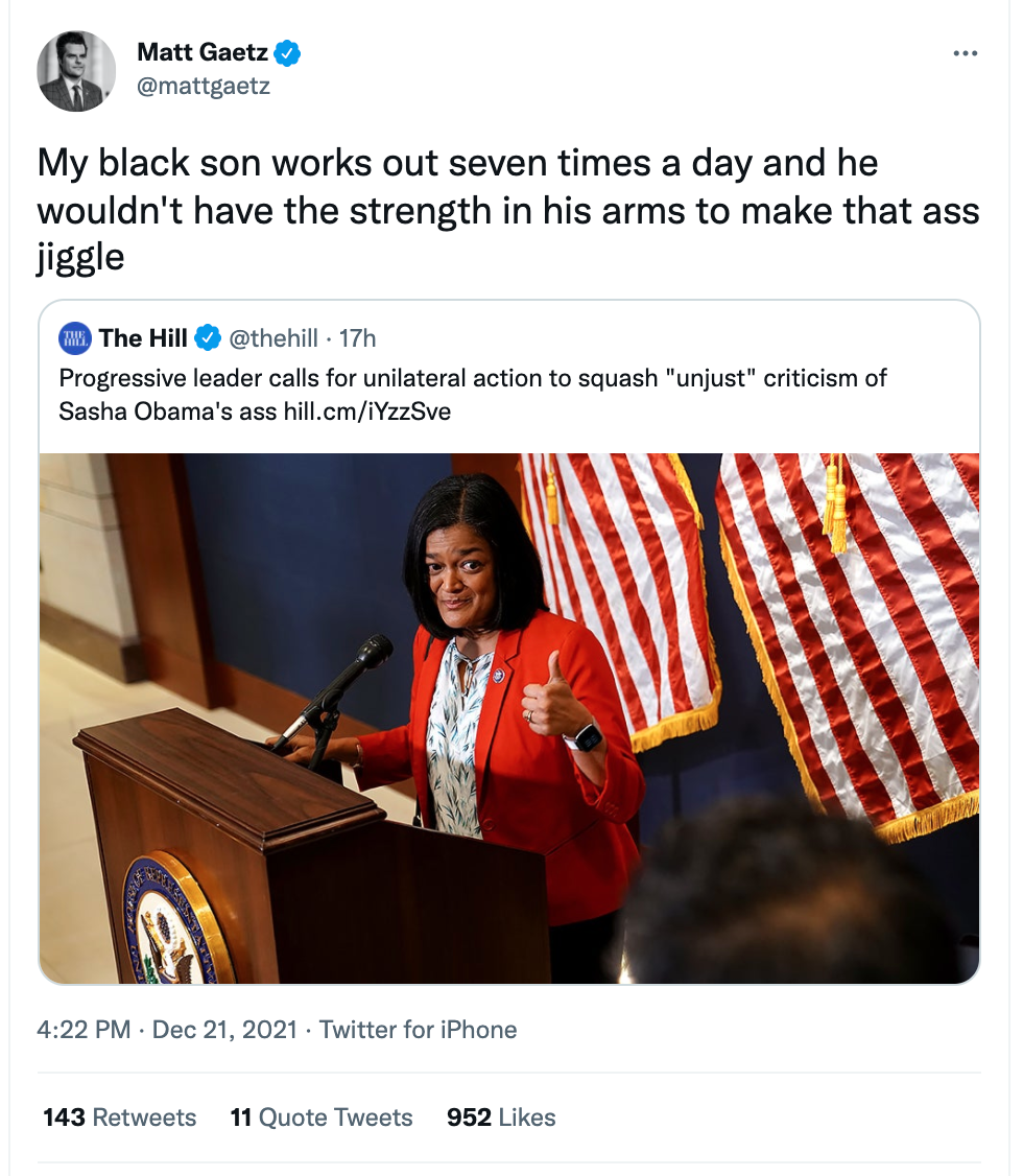 Republican and Trump loyalist Matt Gaetz had this to say in response to Democrat defense of the black woman’s flat ass: