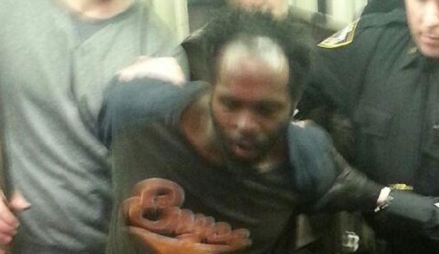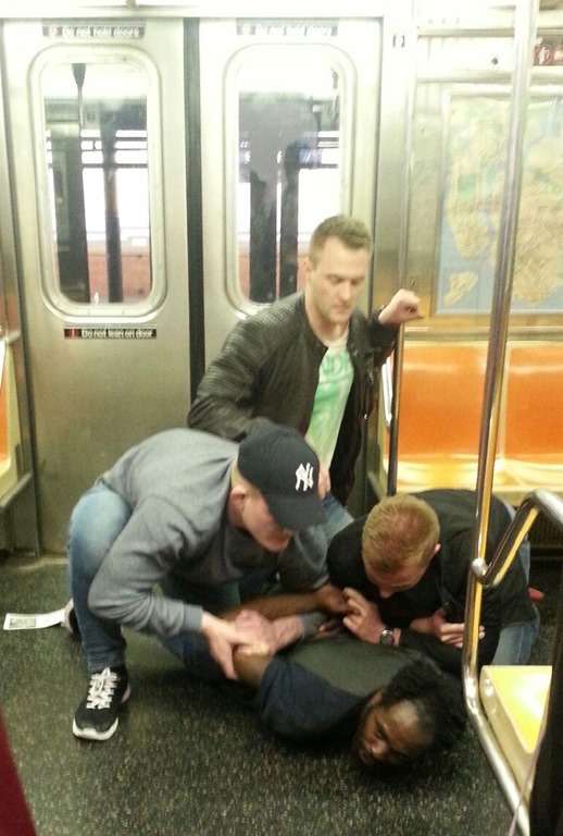 When they made their way to the front of the train, they saw one homeless man beating the other senseless, as terrified straphangers fled the car into the Bleecker Street station.