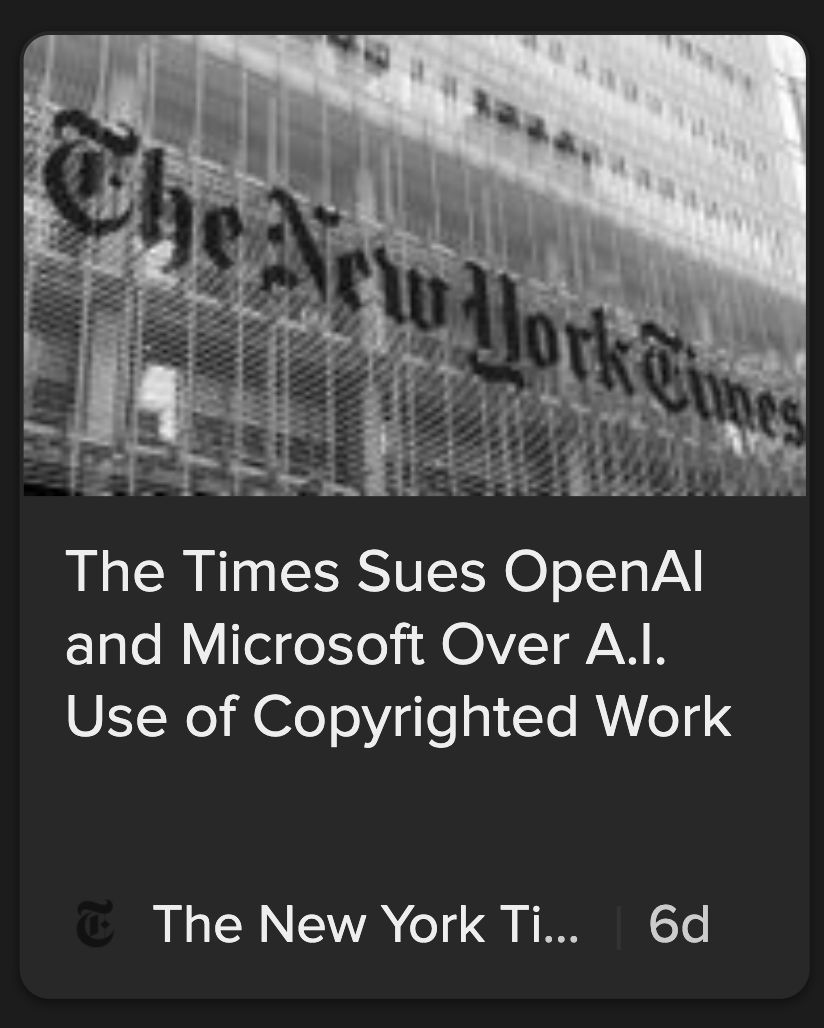 The New York Times is suing OpenAI, which is a case I’m interested in and will write more about in the future. Copyright is actually a relatively obvious way to hinder AI development, and the fact that it is coming from the Times says a lot about who’s trying to get it done.