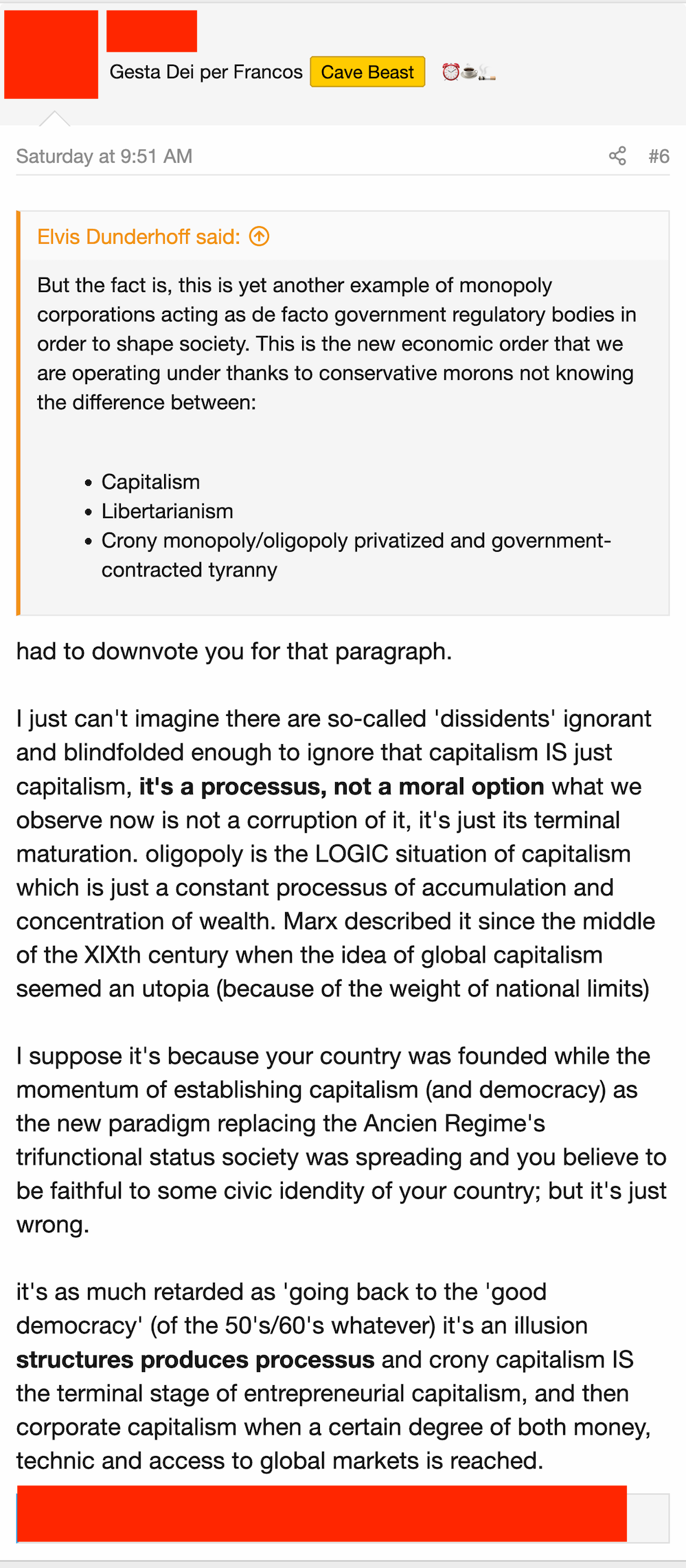 If you want to claim that “capitalism” is a system of government-backed monopolies that prevent the establishment of independent family-owned businesses, wherein the government also has massive welfare programs and affirmative action hiring schemes to ensure women are able to feed off of men’s wealth without marrying them, then okay – by that definition, “capitalism” is definitely bad. But unless you’re a moron, I have no idea why you would refer to this system as “capitalism” unless you were purposefully playing into leftist tropes with the intention of promoting some or other ideology.