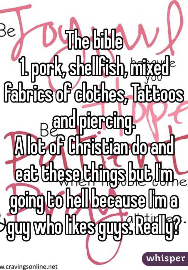 Pork can go bad quickly in hot temps, shellfish can give you food poisoning if it goes bad and it often does, mixed fabrics are a bitch to wash, tattoos are degenerate, vain and signal promiscuity – especially on women, piercings in an era without antibiotics…hmm, yeah no, these are all sound points.