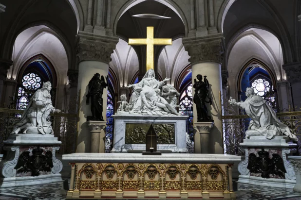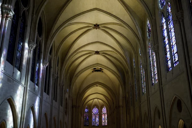 Images broadcast live of a site visit by French President Emmanuel Macron showed the inside of the iconic cathedral as worshippers might have experienced it in previous centuries, its wide, open spaces filled with bright light on a crisp and sunny winter’s day that lit up the vibrant colors of the stained glass windows.
