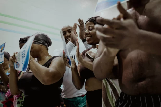 At the start of the evening, instructors assessed a group of excited, younger children on their comfort in the water. Later, older adults got into the pool, practicing essential skills like floating as participants cheered each other on. Volunteers handed out free goggles and caps and shared information on future lessons. At the end, everyone received a certificate.