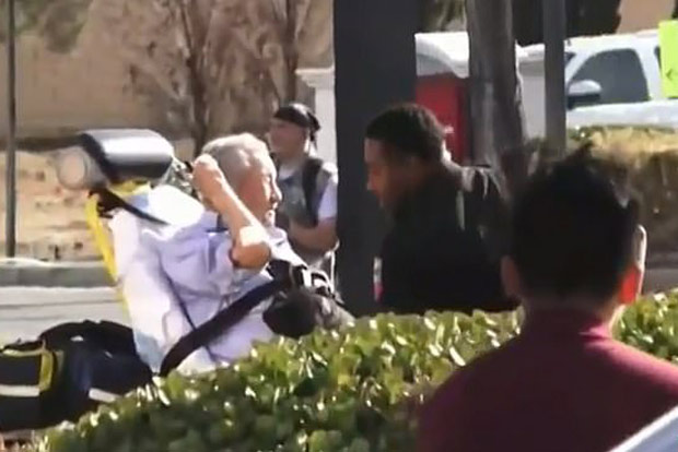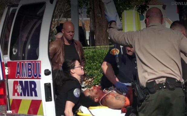 It began when the suspect, described initially as a shirtless Latino man, crashed his car into into the wall of a Carl’s Jr. restaurant, according to the Los Angeles County Sheriff’s Department. He then got out and ran across the street to a nearby McDonald’s, during which time he undressed completely.