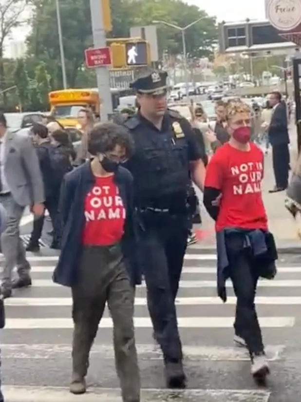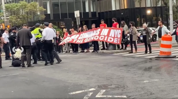 Video posted on Citizen shows a crowd displaying a large red banner with bold white lettering declaring “No war criminals in NYC!” — a reference to Israeli Prime Minister Benjamin Netanyahu’s Thursday visit to the Big Apple to address the United Nations.