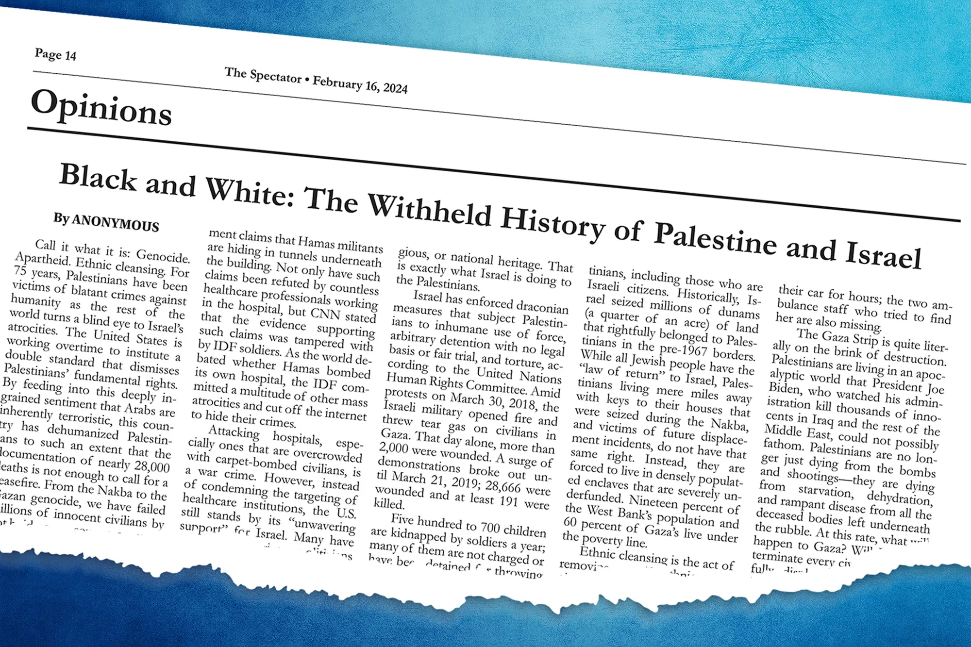 “Call it what it is: Genocide. Apartheid. Ethnic cleansing. For 75 years, Palestinians have been victims of blatant crimes against humanity as the rest of the world turns a blind eye to Israel’s atrocities,” the screed thundered on page 14 of The Spectator. “Before October 7th, Gaza was nearly off the radar, despite Israel’s relentless murder spree at the beginning of 2023.”