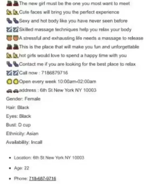 “The new girl must be the one you most want to meet,” the listing reads. “A stressful and exhausting life needs a massage to release…this is the place that will make you fun [sic] and unforgettable…hot girls would love to spend a happy time with you.”
