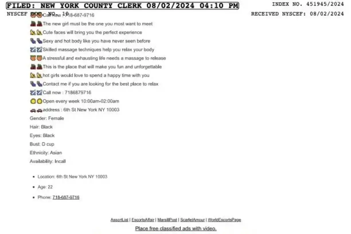 A sex act is advertised on another site festooned with pictures of nude women, court docs show, boasting that the spa contains only “HIGHLY TRAINED 1000% YOUNG GIRLS.”