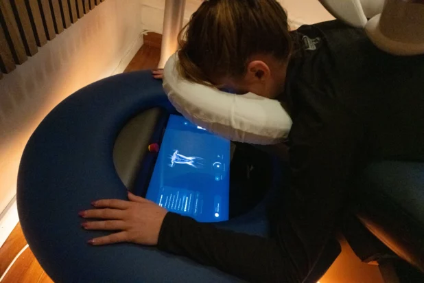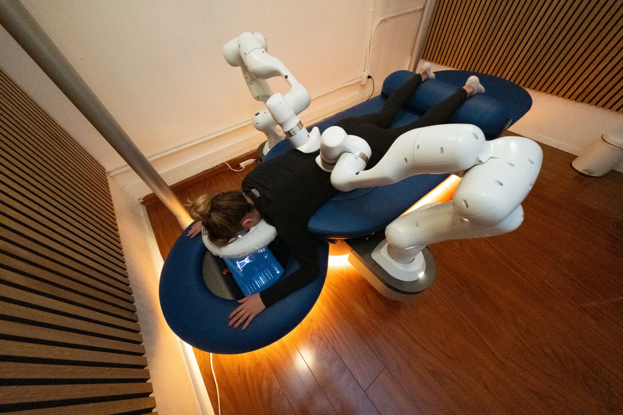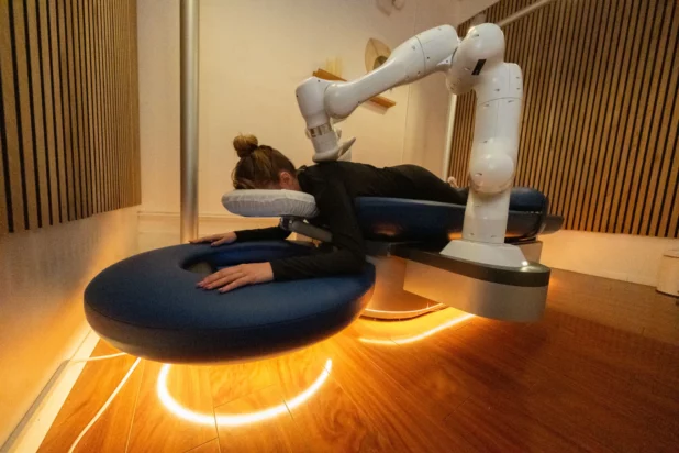 The Aescape AI-enhanced massage tables use two robotic “arms” to scan the user’s body — clothed in friction-free clothing provided by the company upon arrival — in order to generate over 1.1 million 3D data points to map the body. From there, it can identify key anatomical points to guide the “hands” to perform a targeted massage, which can be controlled from a touchscreen directly under the headrest.