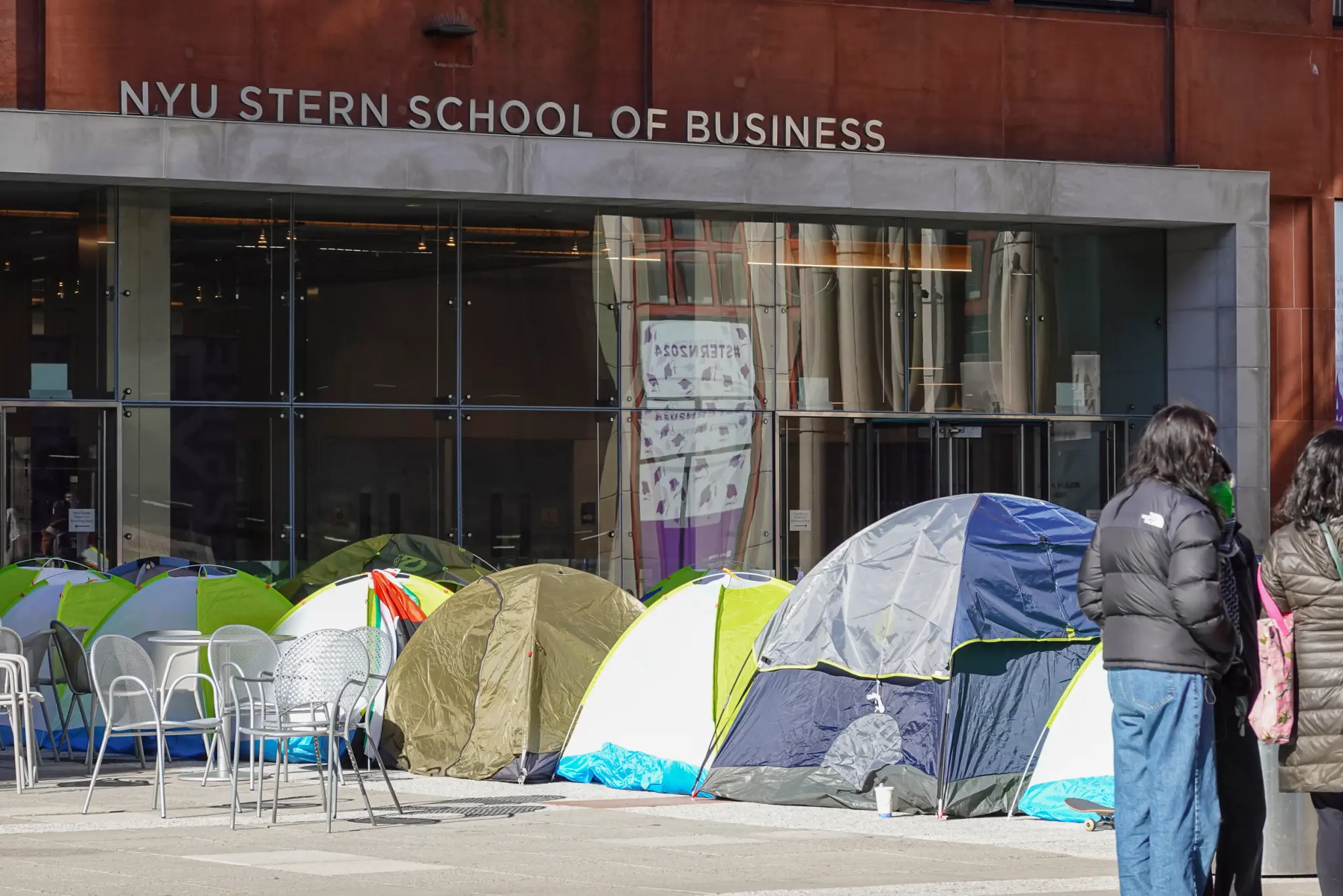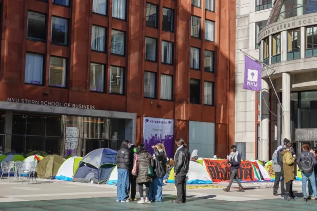 The protesters made camp across NYU’s Stern School of Business in Manhattan on Monday morning as they called on the school to divest from the Jewish State and push for an end to its campaign across the Palestinian enclave.