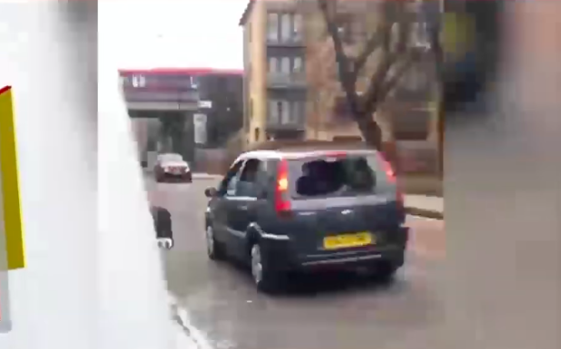 In a clip filmed by a witness, one of the alleged attackers can be seen clinging to the car’s bonnet in an attempt to get away.