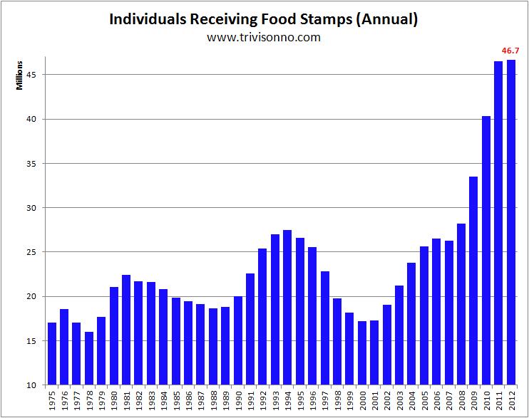 Food stamp usage has sharply increased since Barack Obama took office. We’ve gone from 28 million Americans on food stamps at the end of George W. Bush’s second term in 2008 to over 47 Million in President Obama’s fifth year in office. American’s using food stamps has almost doubled in five years, look at the chart below.