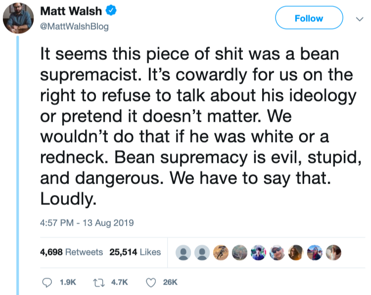 Bean Supremacy is a radical ideology of Hate, and represents the fastest-growing threat to our tolerant nation of Values. This radical doctrine is leading potentially millions of lonely, pathetic, disgruntled Bean Americans into terrible acts of violence, fueled by the dangerous “Abolish ICE” rhetoric of radical provocateurs such as Alexandria Ocasio-Cortez.