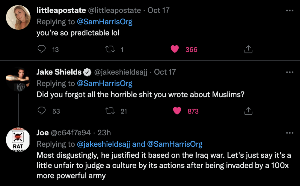 Neither Ben Shapiro nor Sam Harris ever say anything that matters, but they are able to make themselves the focus of the social debate by using one another as reference points.