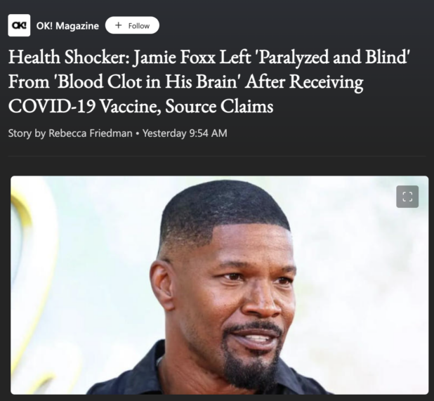 “Jamie had a blood clot in his brain after he got the shot. He did not want the shot, but the movie he was on, he was pressured to get it,” confessed the podcaster — who formally worked as a columnist for the New York Daily News and as a host of the E! series Mysteries and Scandals — during an appearance on Dr. Drew Pinsky’s online show “Ask Dr. Drew.”