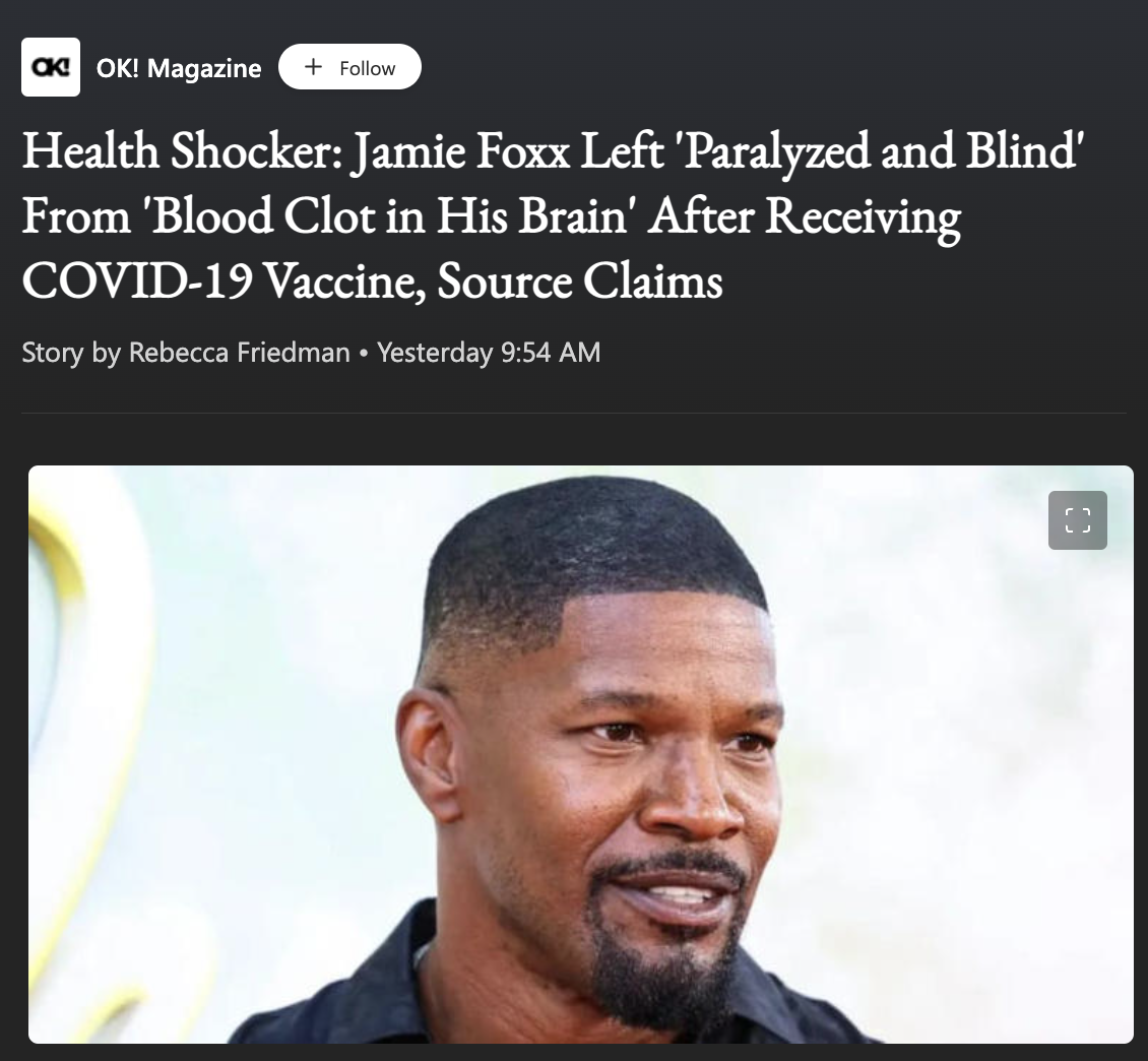 The Django Unchained star is said to be “partially paralyzed and blind,” in addition to a series of other complications after receiving the COVID-19 vaccine, Hollywood journalist A.J. Benza claimed after speaking to a source close to Foxx.