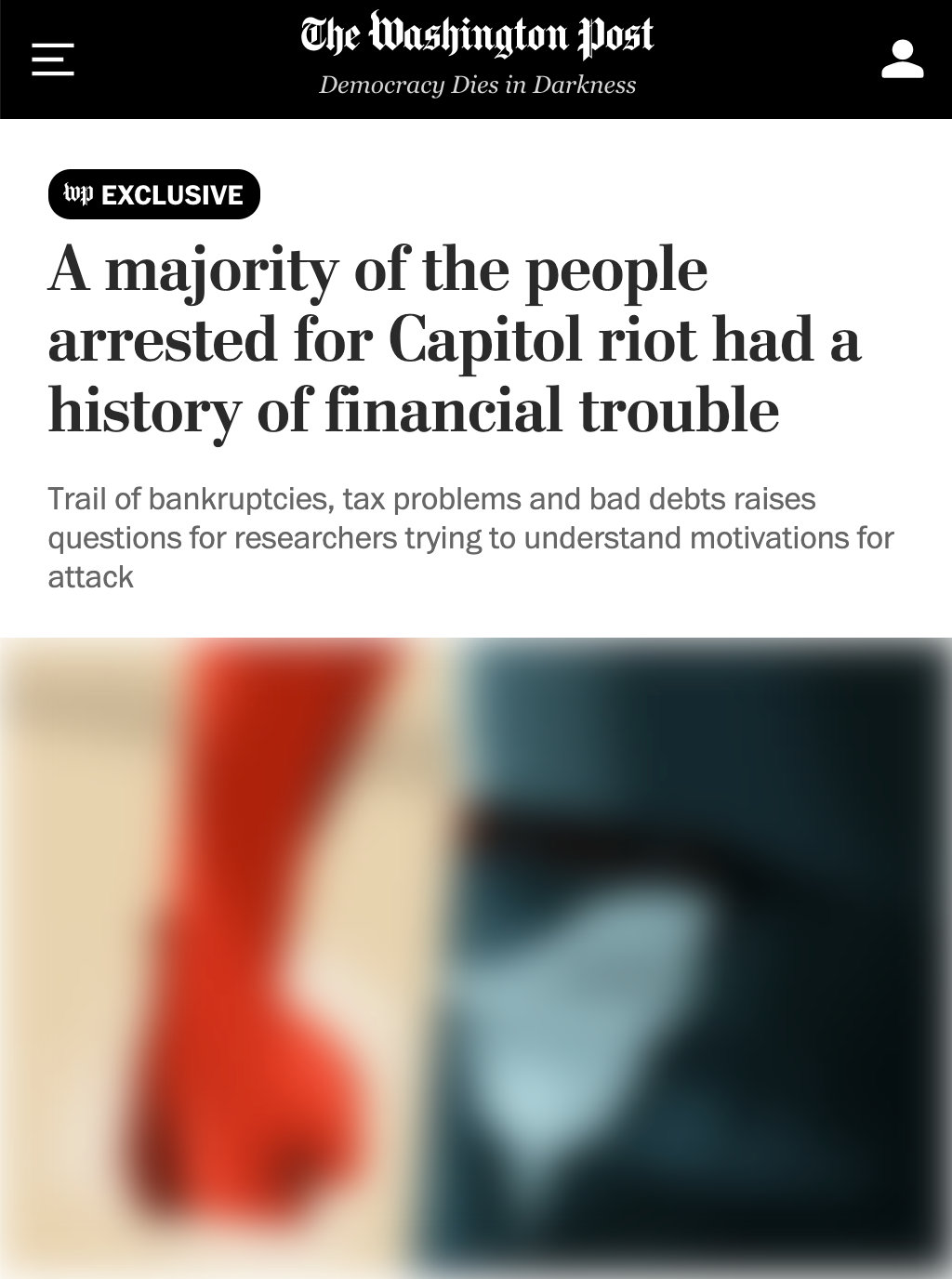 According to the article, virtually everyone arrested for rioting at the Capitol was poor. Ashli Babbitt, who was killed by cops during the event, was hit with a $23,000 fine from a lender after she took out a loan to try to save her failing pool-cleaning business.