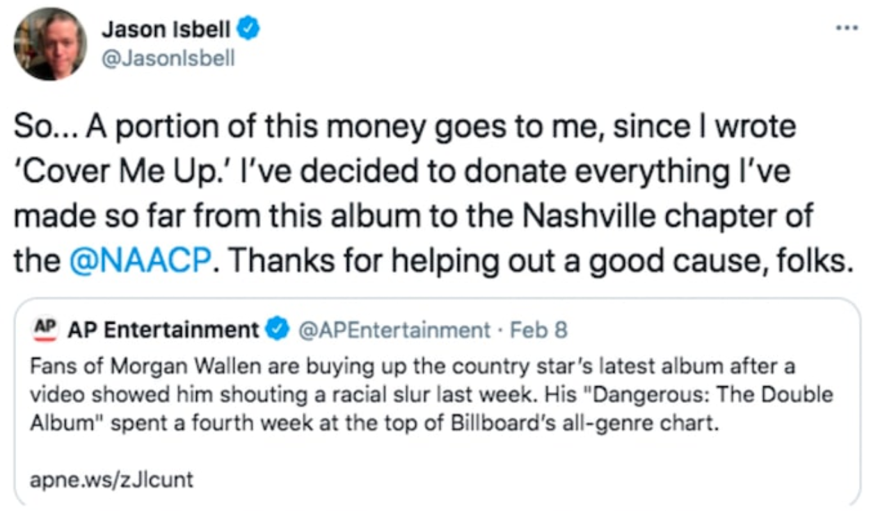 Morgan Wallen said the n-word, and he’d covered one of Isbell’s songs, so Isbell donated money to the blacks.