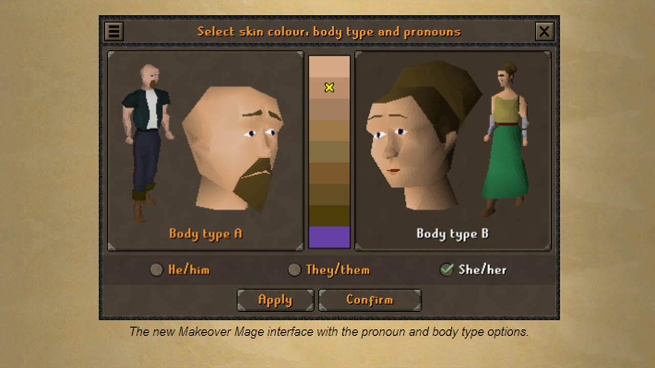 A new “Diversity & Inclusion” update for Old School RuneScape was released today that removed the 20+ year old MMORPG’s biological male and female sexes from its character creator, as seen above. In their place are the options “Body type A” and “Body type B.”