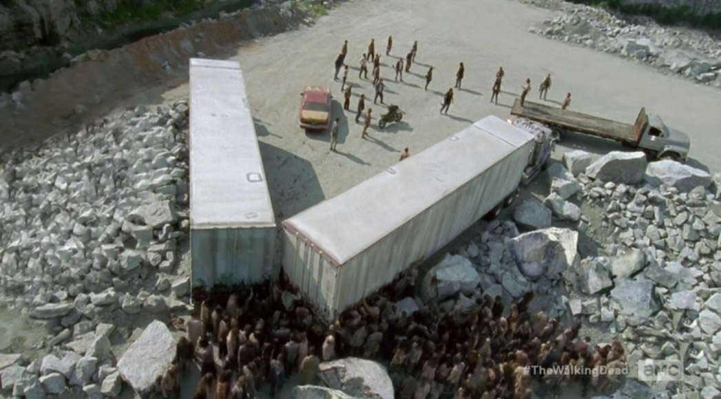 The first episode of season six, which aired last Sunday, actually featured a “camp” of zombies trying to break through a line of trucks.