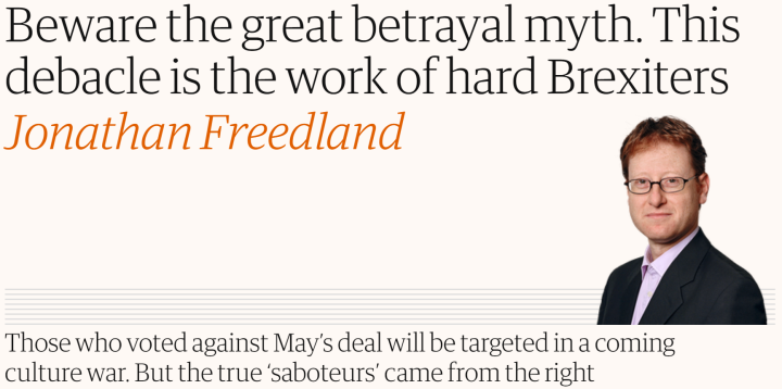 The outlines of the myth are already in place. Its victim is a noble people who voted as one on a summer’s day in 2016 for a simple, clear desire – leave – but who were thwarted by feckless and self-serving MPs, by the political class, by the liberal elite, by the BBC, by the universities, by Brussels bureaucrats, by the corporations, by the Germans, by the hidden forces of darkness who together conspired against the hardworking men and women of this country.