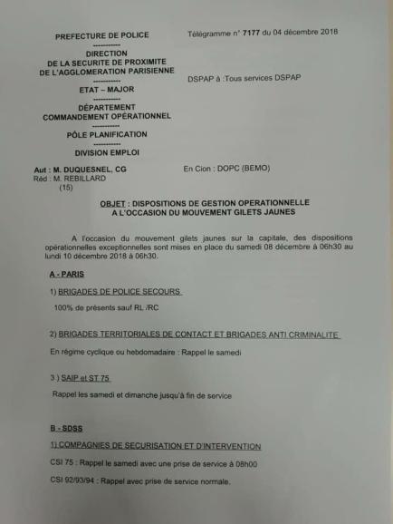In this exclusive document, you can see the mobilization plan of the Paris police headquarters for Saturday, December 8th. All units, without exception, are mobilized. All holidays canceled.