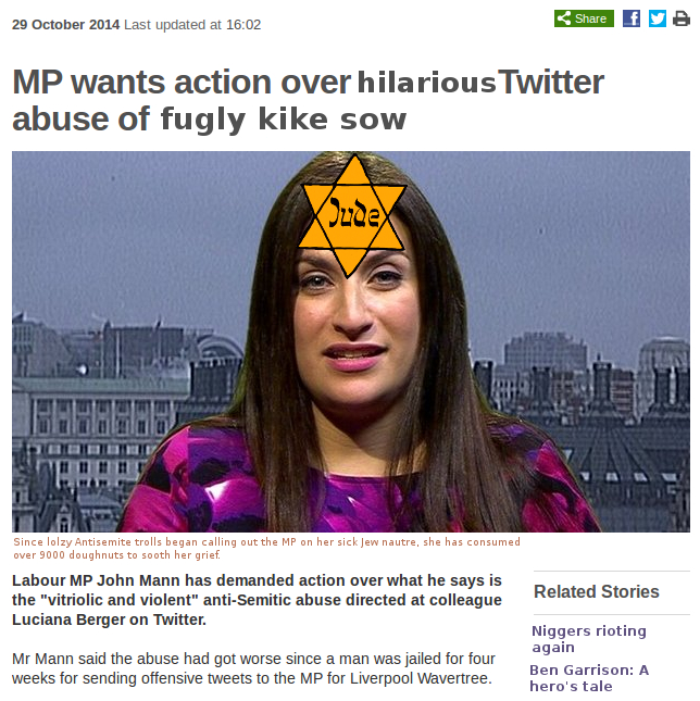 The Daily Stormer’s own Operation: Filthy Jew Bitch, launched last week against the filthy Jew bitch Luciana Berger, has reached the floor of parliament, the BBC reports.