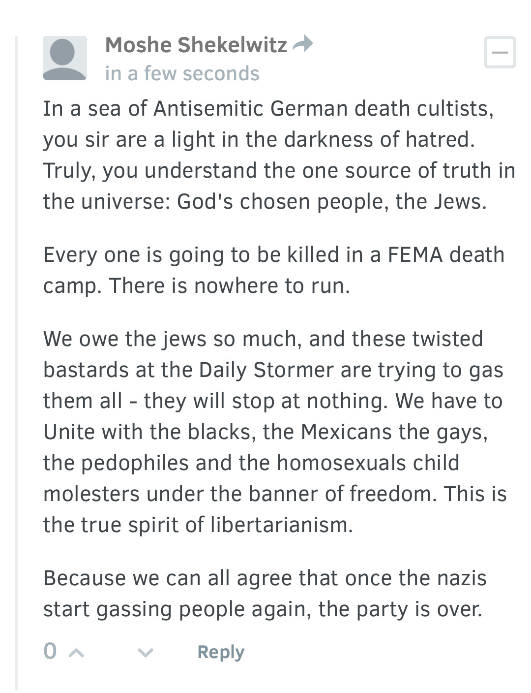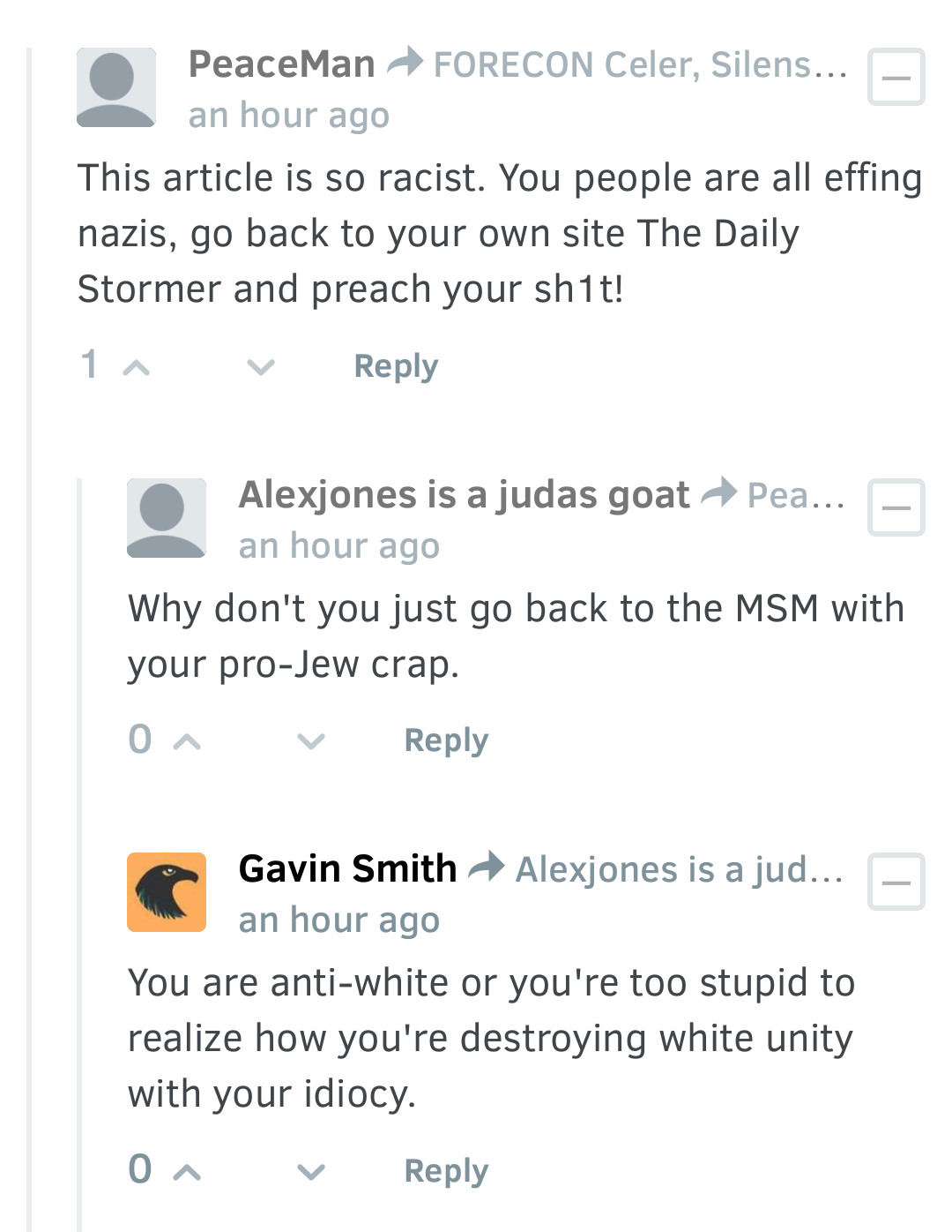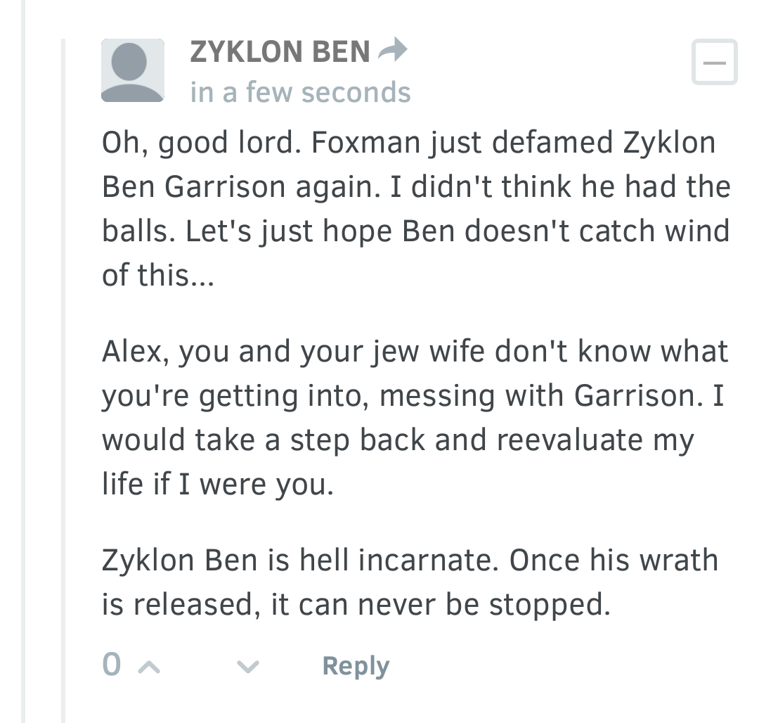 And these articles just provide us an opportunity. The above mentioned article is already filled with comments by Stormer trolls pretending to be Jews saying that Alex must be planning to gas them and asking if he is going to gas his own Jewish wife as well.