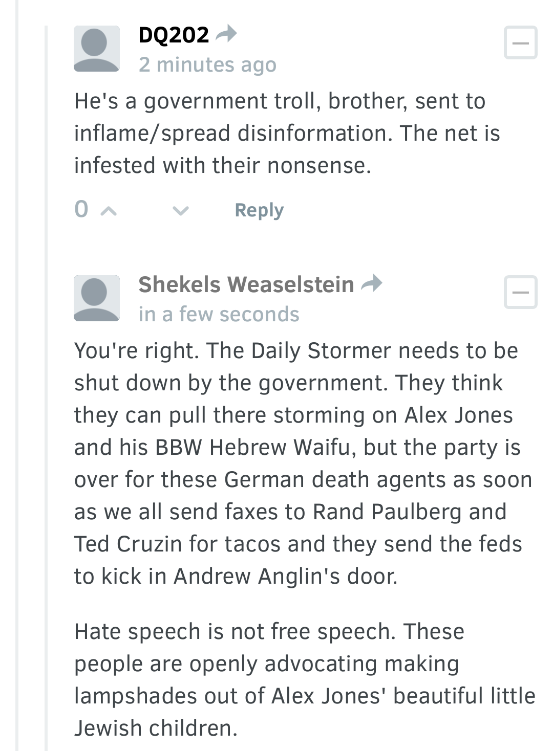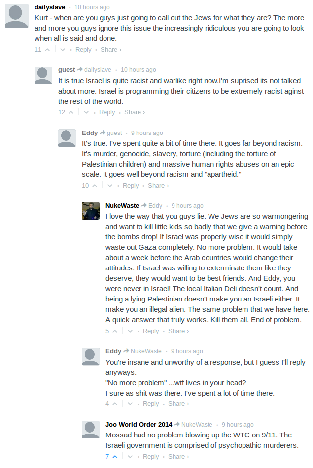 The comments section has descended into complete chaos, as the Jewish Internet Defense Force has ramped up its defense of the Jews and their Jew State in response to Daily Stormer trolling. It is unclear if anyone who actually listens to Alex Jones is even bothering to comment anymore. The JIDF comments are so absurd that they are indistinguishable from satirical comments by Stormer trolls. They are now doing our work for us. This was part of the plan.