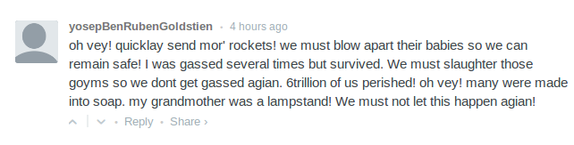 For instance, a Jew troll says “if you support Palestine, you support murder. I stand with Israel.” You respond “you’re right, these Palestinians are trying to commit a new Holocaust, they are no better than the Nazis of the Illuminati. As Alex Jones told us last week, Palestinians have already been caught using the skin of kidnapped Jew soldiers to make lampshades. The children who were bombed at the UN schools were using Jewish fat to produce Jew soap, under the direction of the Antisemites who control the NWO UN.”
