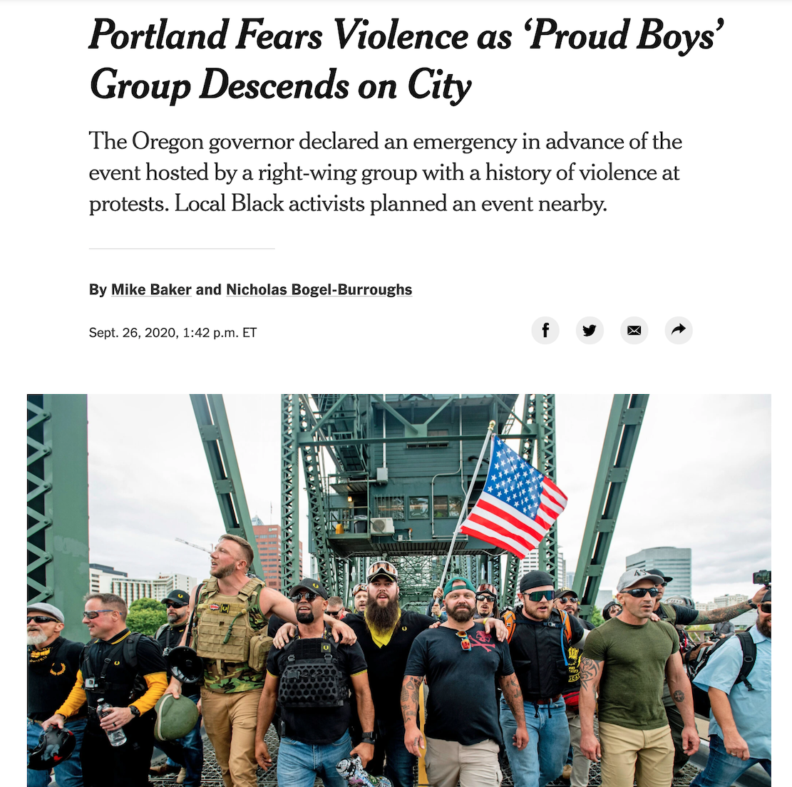 Twenty minutes ago, the New York Times published an article saying the city “fears” violence from these Proud Boys.