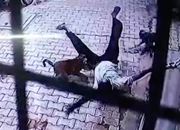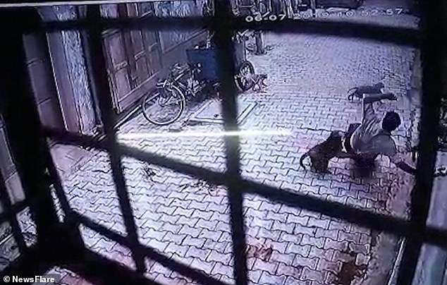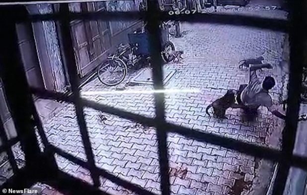 In July a business man in Nikunj Goyal, from Vrindavan, parked his scooter and was walking to his front door when he was viciously attacked by a gang of macaques, in moment captured on CCTV.