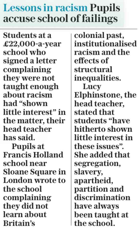 Meanwhile, pupils at an elite British fee-paying school have complained that they are not being given enough anti-white brainwashing material. Teachers have retorted with claims that their curriculum is already full of material designed to instill a sense of guilt into white children. But the children insist they want to hate their own race even more and need more Blame Whitey propaganda in order to do it.