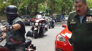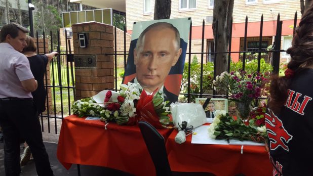Members of the Russian community — some in full Russian military regalia — as well as representatives of the Turkish (yeah, what a cheek), Serbian, and Palestinian communities expressed their sympathies and showed support for Russian president Vladimir Putin and the Syrian government in their fight against western-backed terrorists. A group of rugged Russian bikers also turned up to pay their respects.