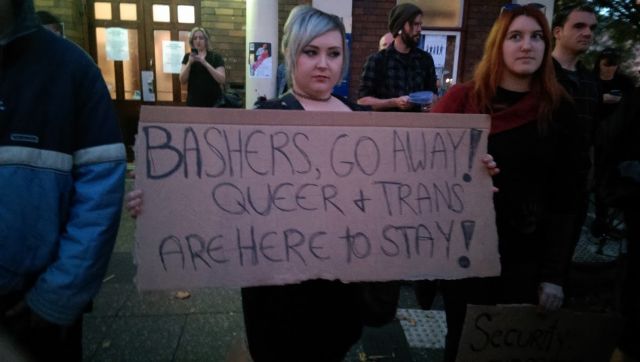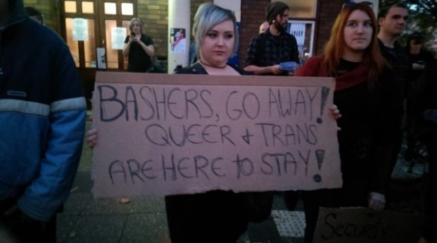 A hideous transgender creature was joyously beaten inside a Sydney hotel on Friday evening prompting the local SJW population to come together the following night and protest against the “transphobia” hate.