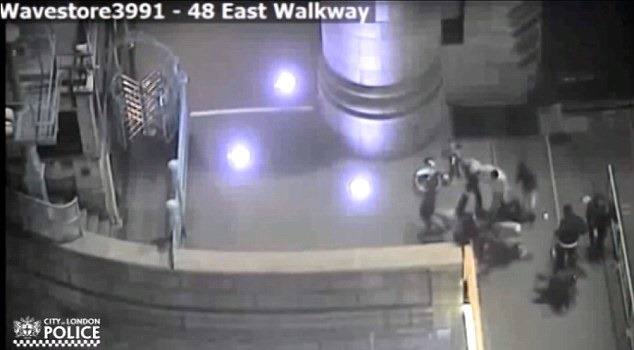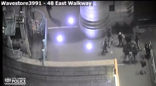 City of London Police are appealing for information and say the sustained attack, which lasted around a minute and was caught on CCTV, left the victim with cuts and bruises.