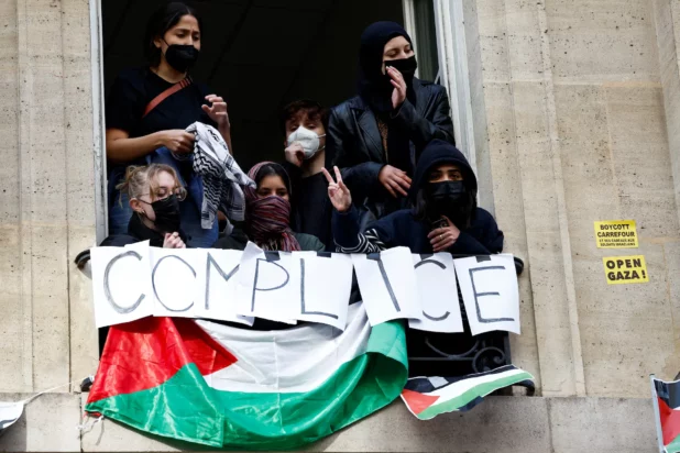 Chanting their support for the Palestinians, some students had been occupying a Sciences Po building since the night, displaying Palestinian flags at windows and over the entrance.