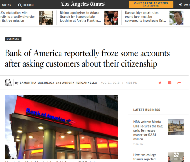 His case isn’t unique. In recent months, Bank of America has been accused of freezing or threatening to freeze customers’ accounts after asking about their legal status in the U.S.. In July, the Washington Post reported that multiple customers had been locked out of their accounts after Bank of America questioned whether the account holders were U.S. citizens or dual citizens.