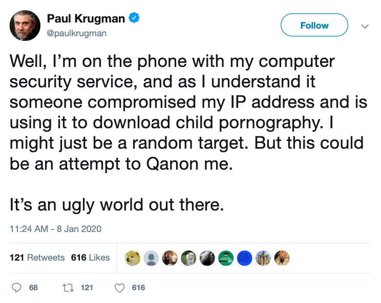 “Well, I’m on the phone with my computer security service, and as I understand it someone compromised my IP address and is using it to download child pornography,” Krugman wrote in the tweet. “I might just be a random target. But this could be an attempt to Qanon me. It’s an ugly world out there.”