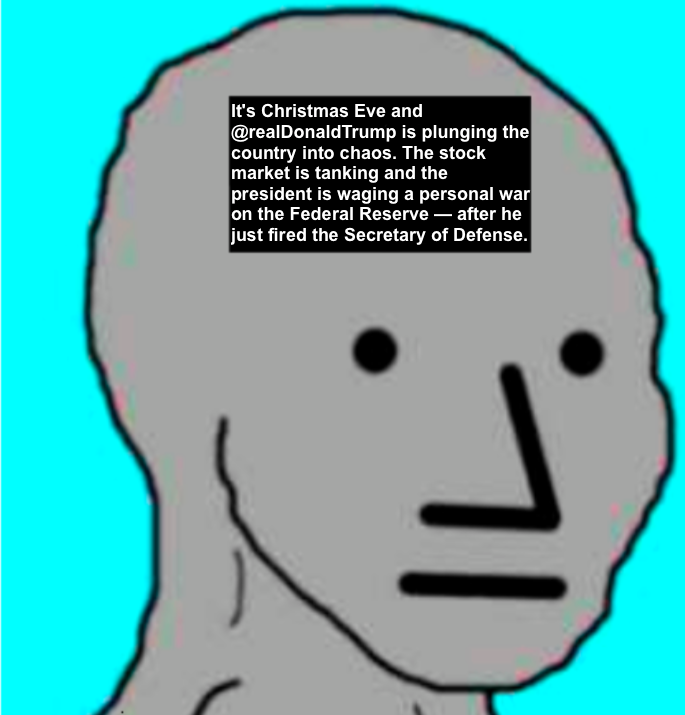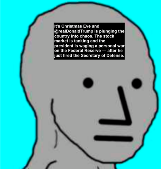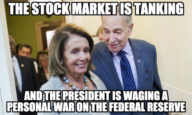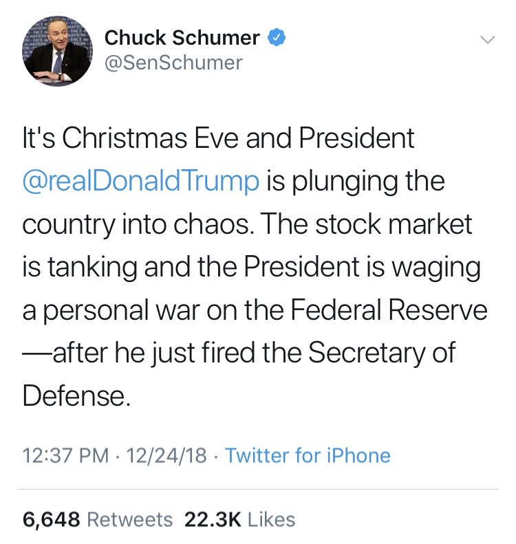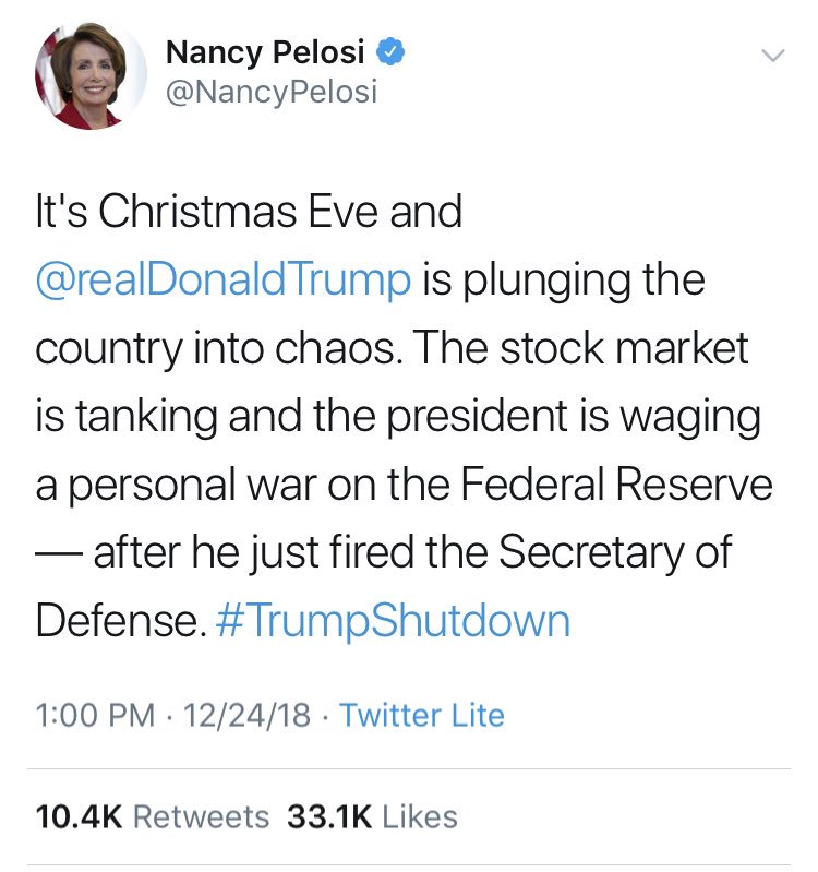 “It’s Christmas Eve and @realDonaldTrump is plunging the country into chaos. The stock market is tanking and the president is waging a personal war on the Federal Reserve — after he just fired the Secretary of Defense” – Nancy Pelosi (and Chuck Schumer)