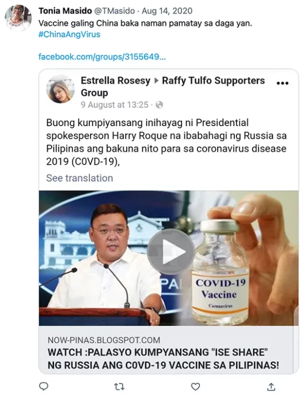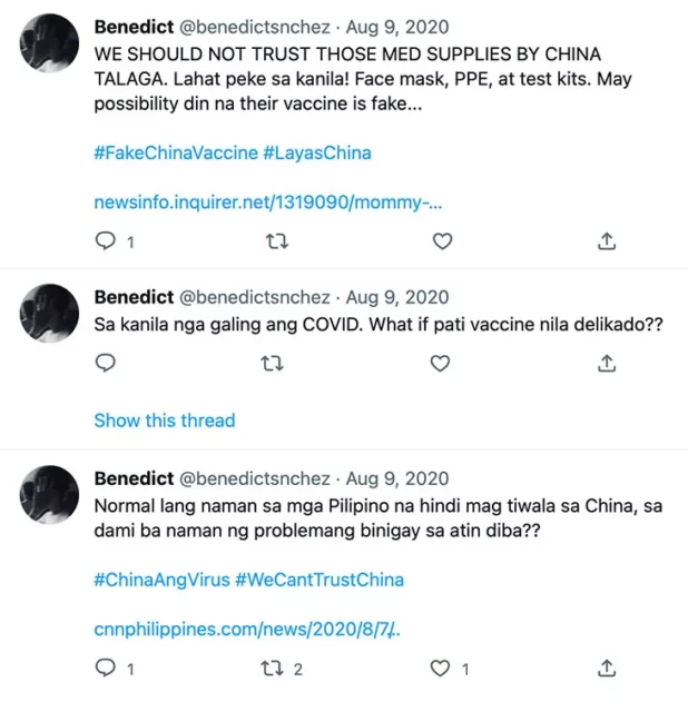 “COVID came from China and the VACCINE also came from China, don’t trust China!” one typical tweet from July 2020 read in Tagalog. The words were next to a photo of a syringe beside a Chinese flag and a soaring chart of infections. Another post read: “From China – PPE, Face Mask, Vaccine: FAKE. But the Coronavirus is real.”