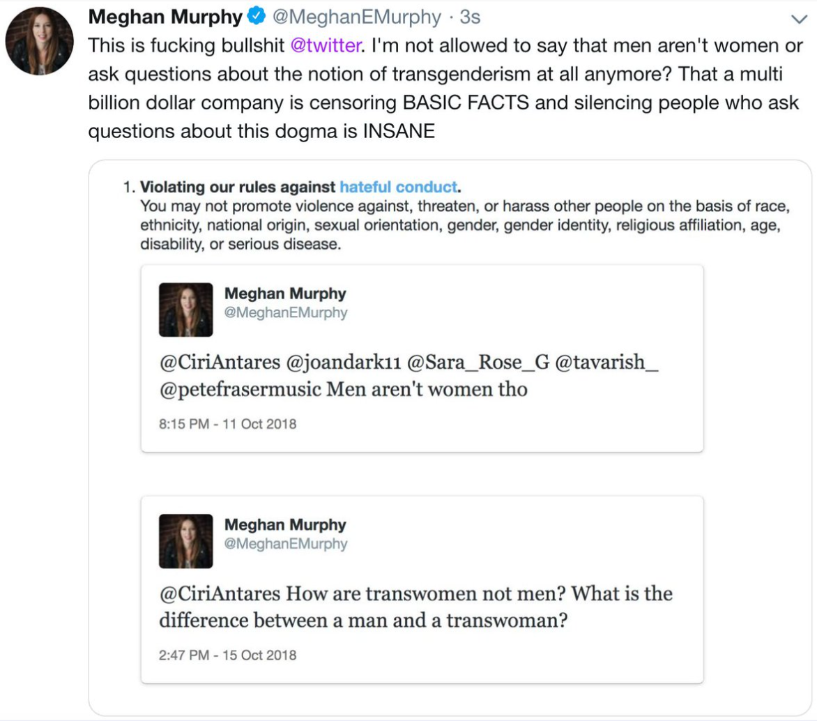 It was a big deal when, all the way back in 2018, Meghan Murphy was banned from Twitter for saying “men are not women tho.”