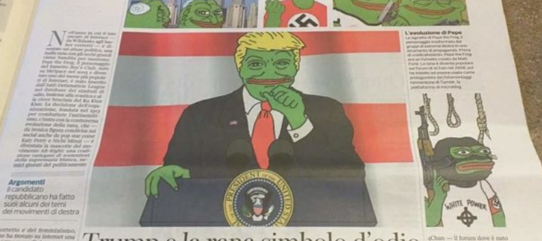 According to an interview by the ADL’s chairperson Jonathan Greenblatt, Donald Trump’s campaign has emboldened and grown “racist groups” by not condemning people who advocate and assert the right to life for whites passionately enough (goes to show the power of our ideas viz a viz theirs) . Basically, the premise that Pepe the Frog is a hate symbol is ridiculous to even the stupidest hair twirling 18 year old girl majoring in Sociology, and on Judetube the well of beta male sperg commentators Jews have traditionally relied upon as power surrogates and cultural gatekeepers are throwing fits at the idea that Pepe the Frog, a meme they like for stupid reasons, is now declared forbidden by Jews because some use it as a vehicle for satire and dissent.
