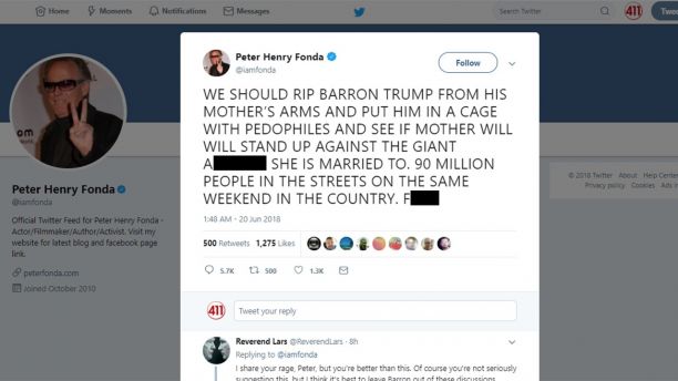 Actor Peter Fonda has a social media army and the Secret Service on his back after a twisted Twitter call to “rip Barron Trump from his mother’s arms and put him in a cage with pedophiles.”